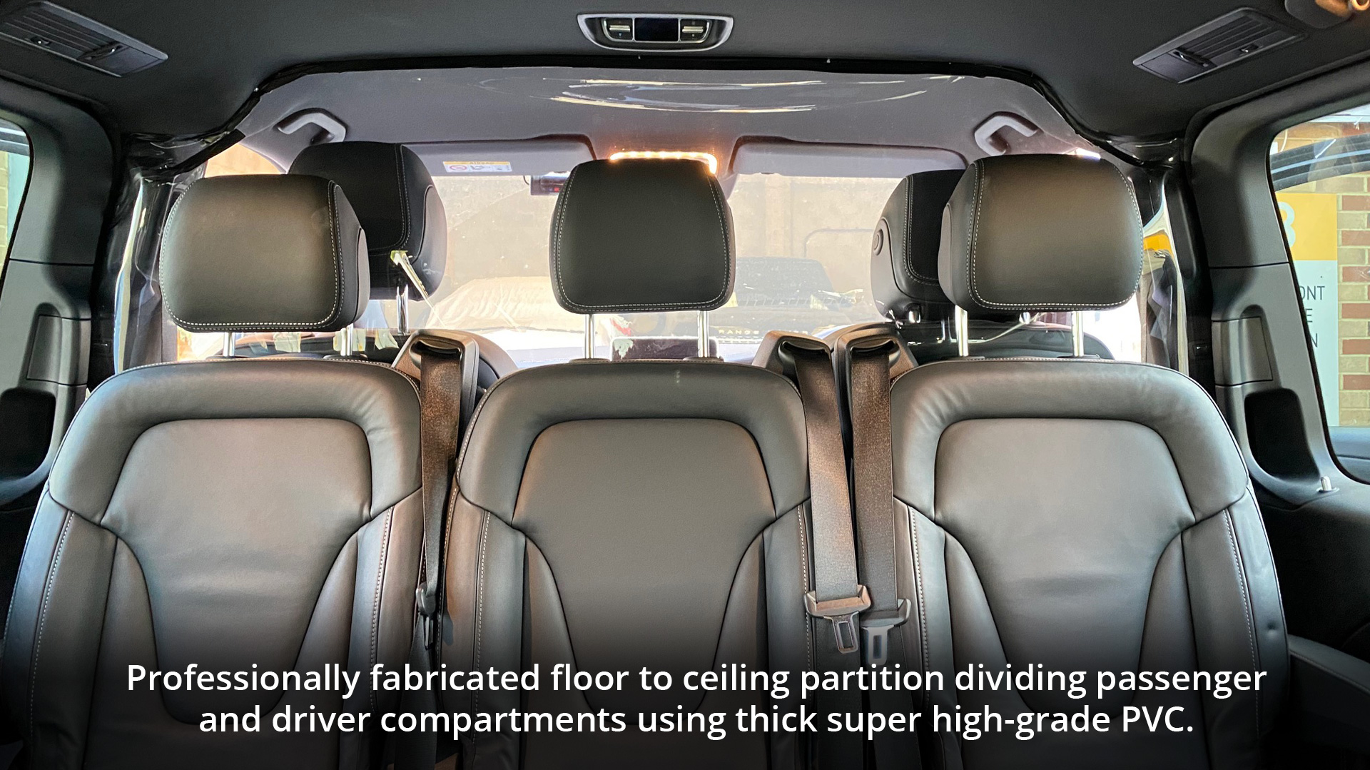 As an addition to our usual high standards; our staff all have undergone intensive training for vehicle sanitisation. Our fleet of Mercedes Benz V-Class (Extra Long Wheelbase) have now been modified with passenger and chauffeur safety in mind with thick high-grade heavy PVC, separating both passenger and chauffeur compartments.